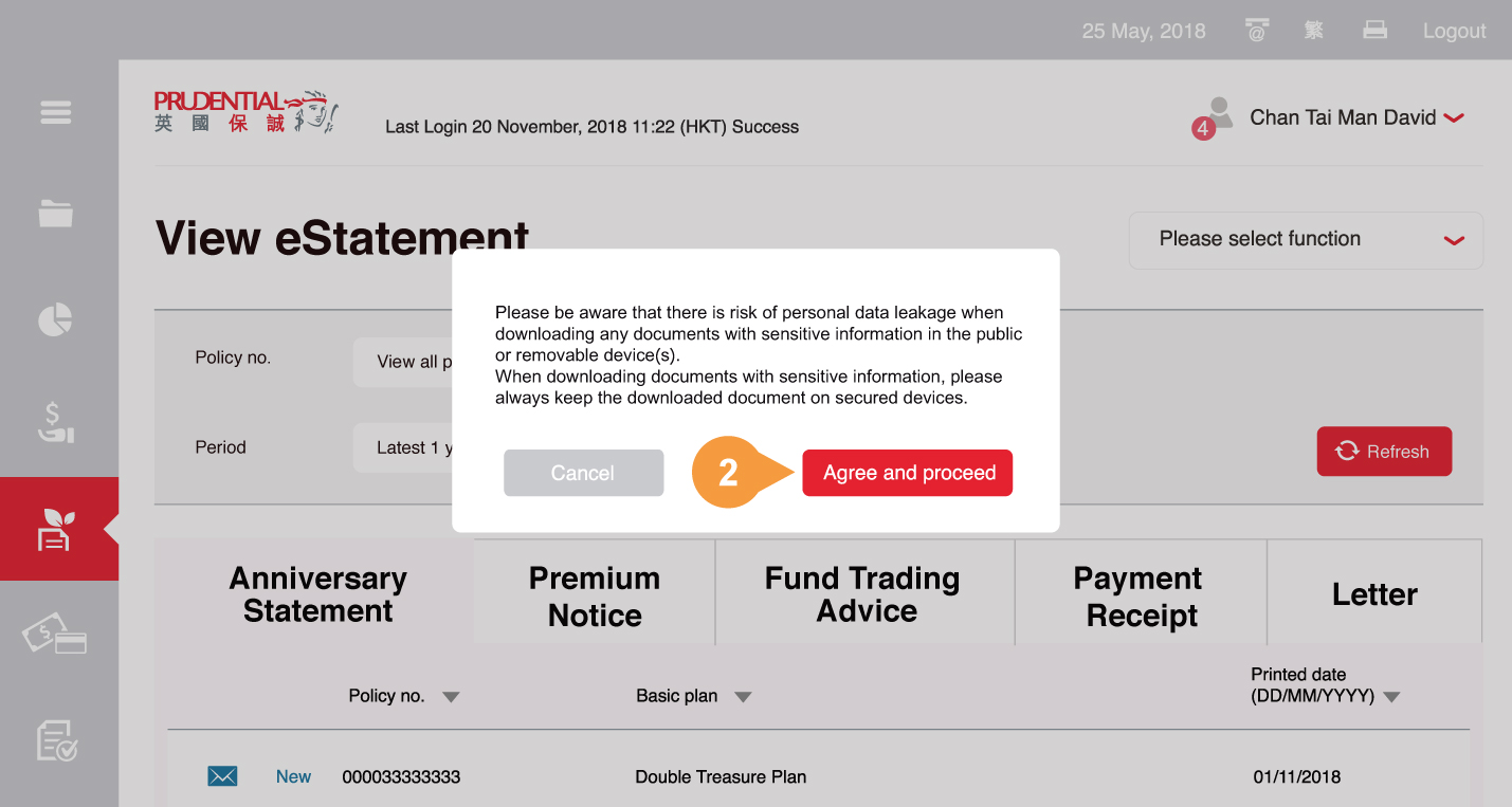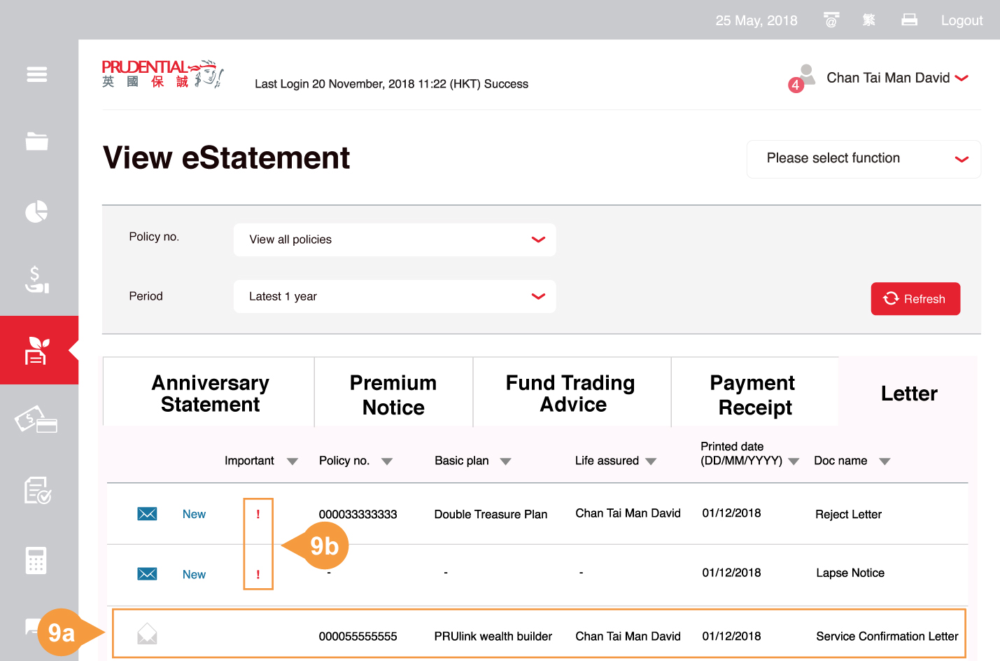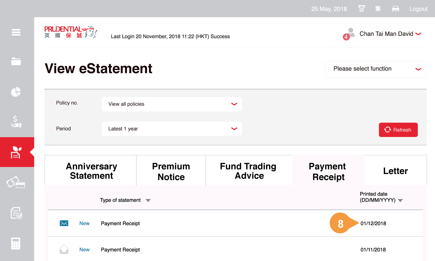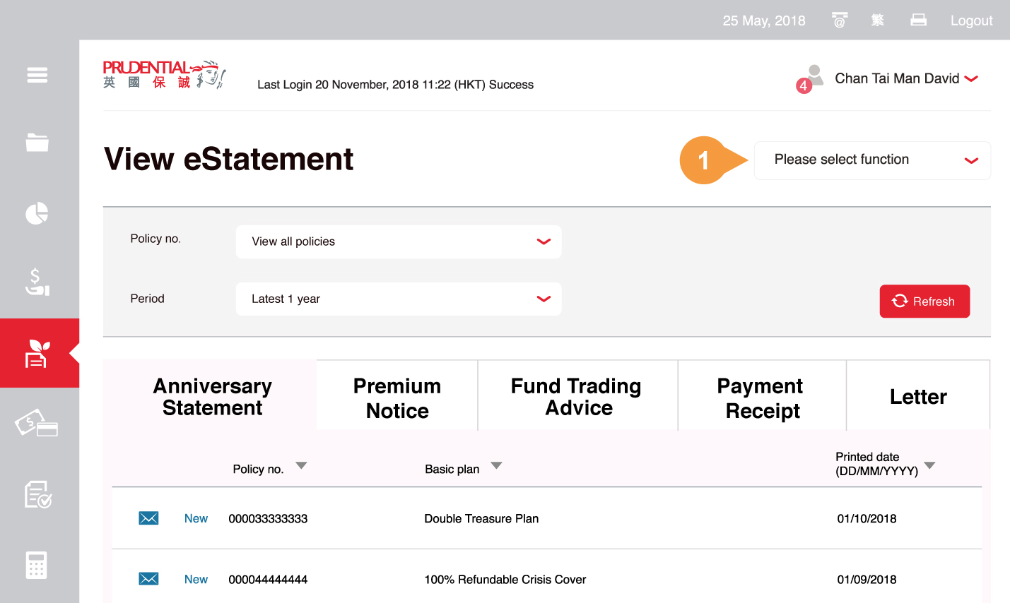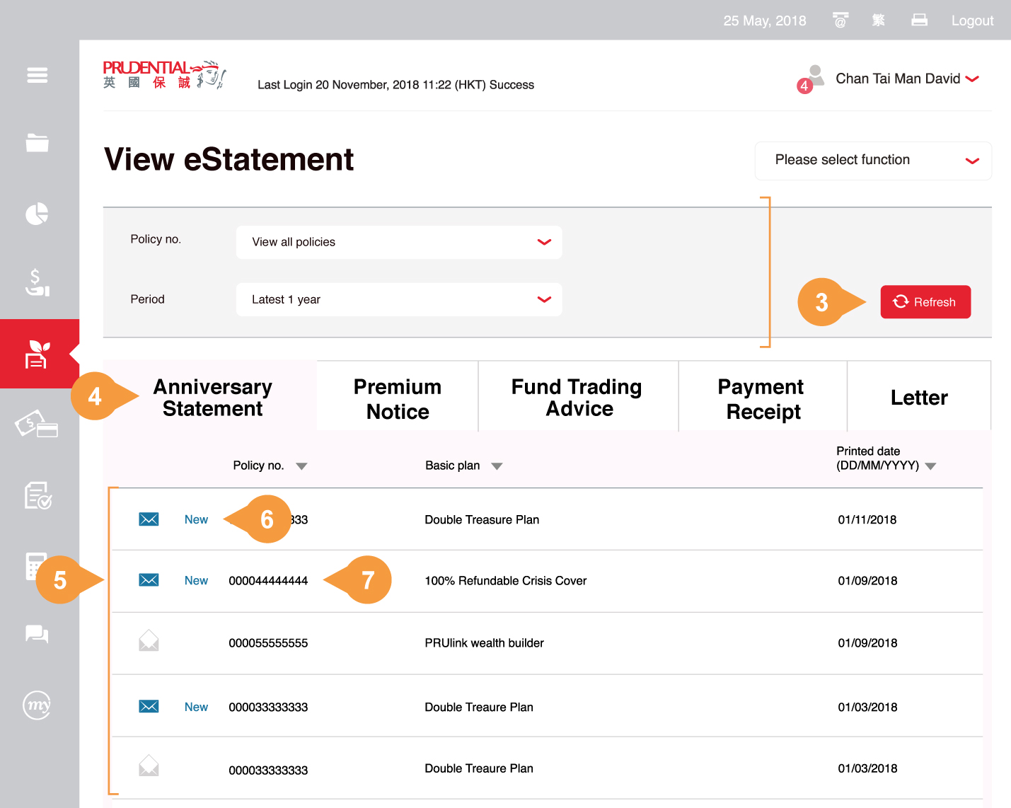 You can select to view the eStatement of all policies or specific policy and period, then click “refresh” to refresh statement list.