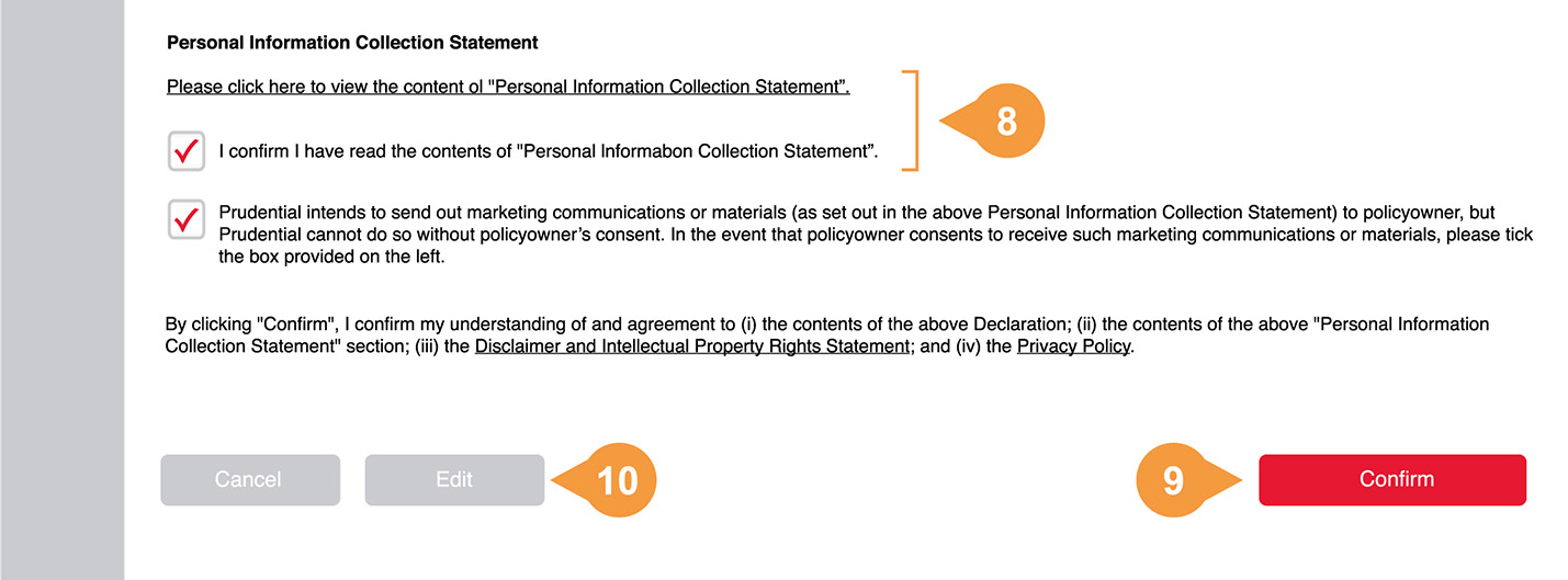 Click “Confirm” to represent the understanding of and agreement to the contents of Personal Information Collection Statement and the Privacy Policy of Prudential to complete the application.