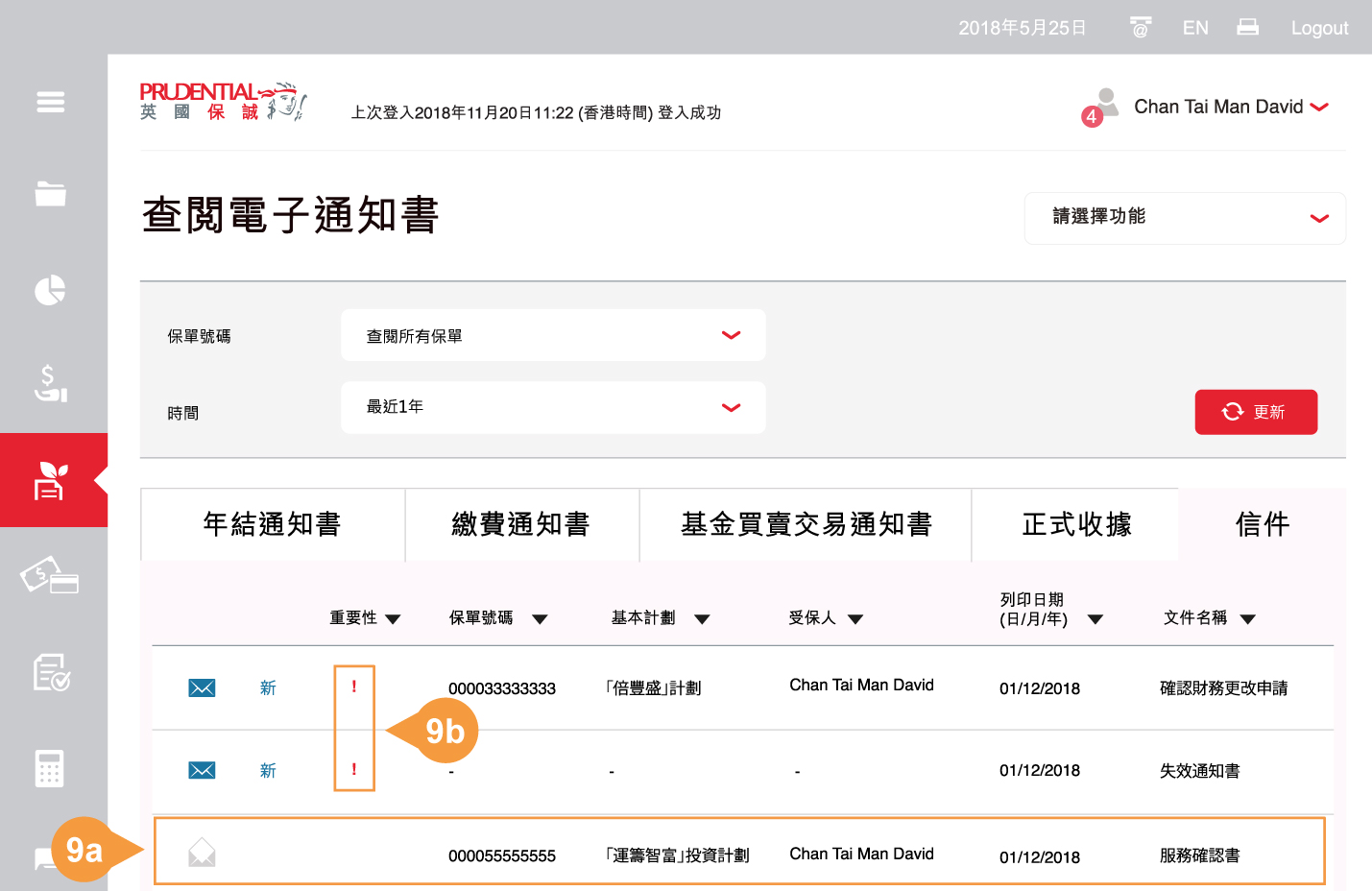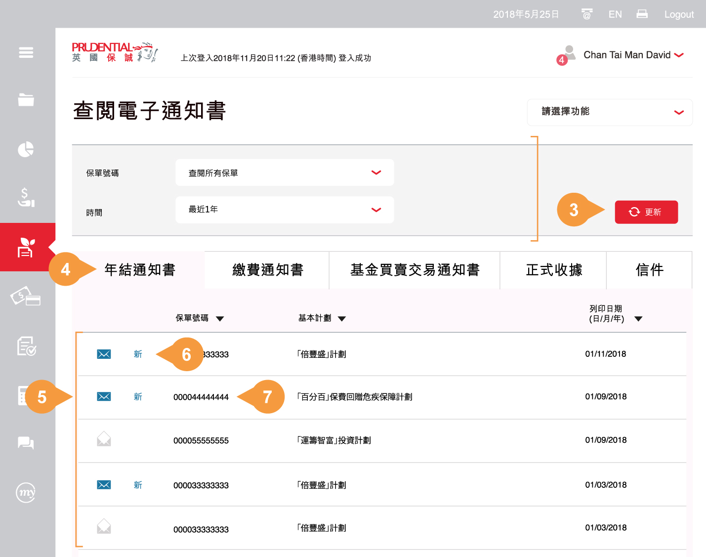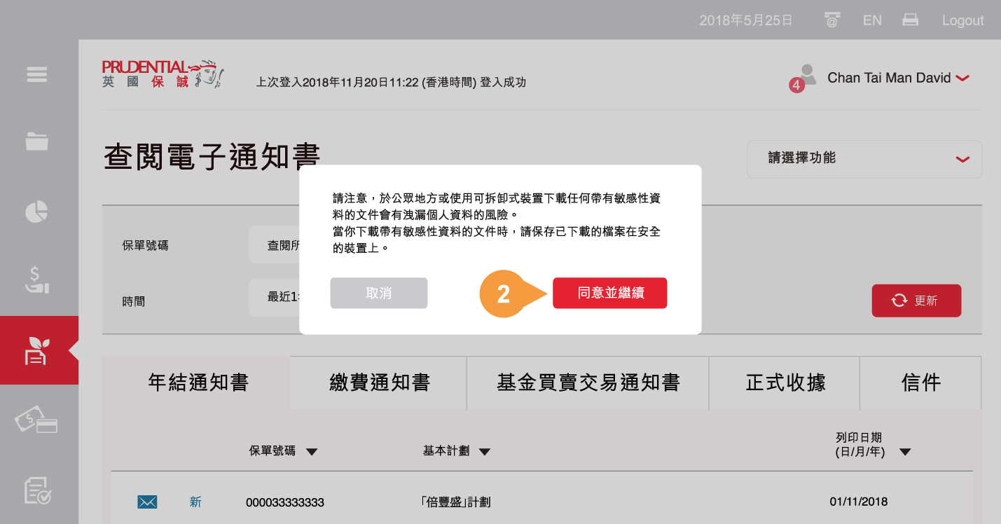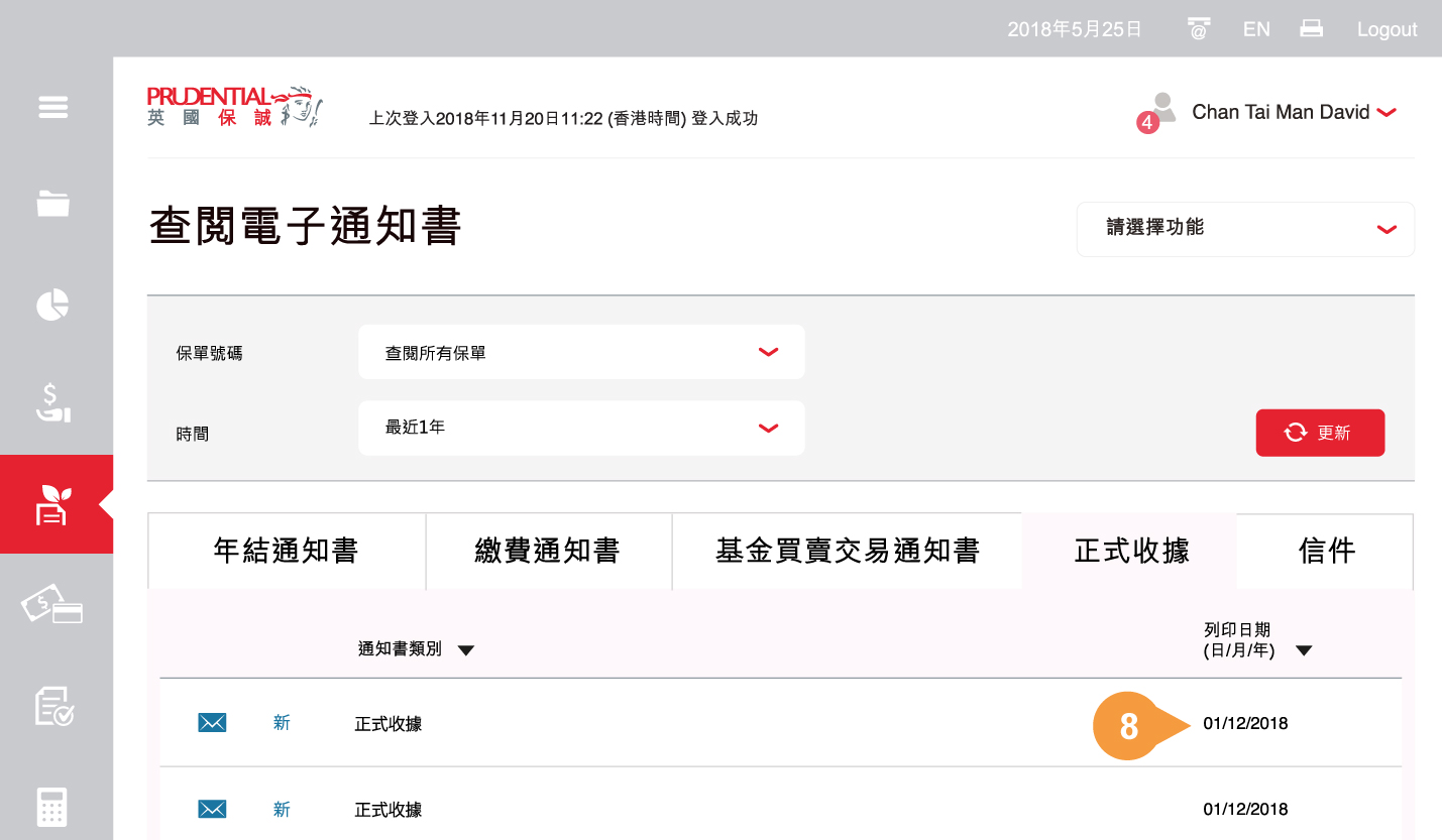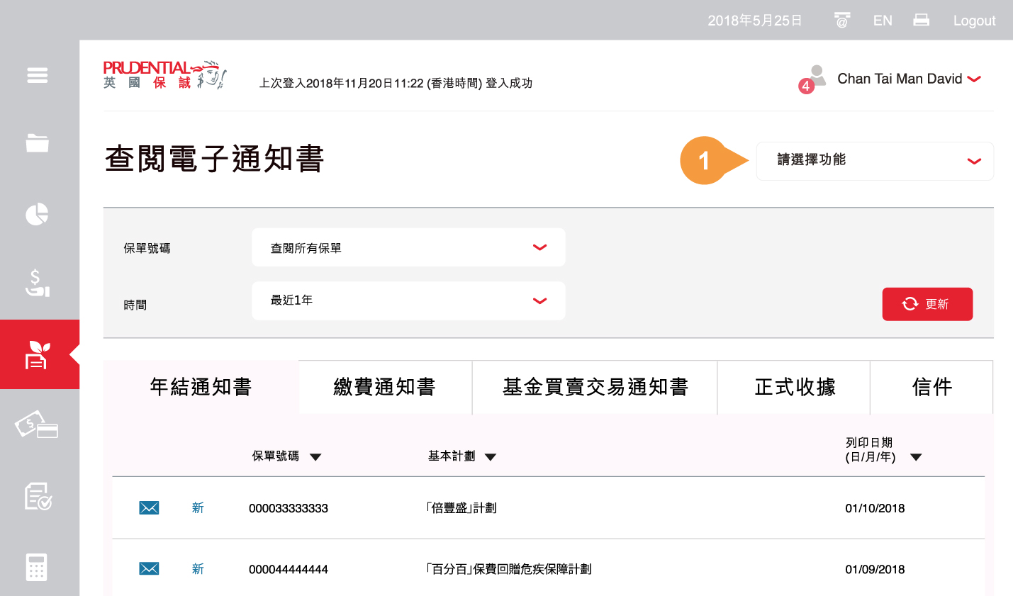 列表會列出您所選的英國保誠人壽保單的電子通知書。