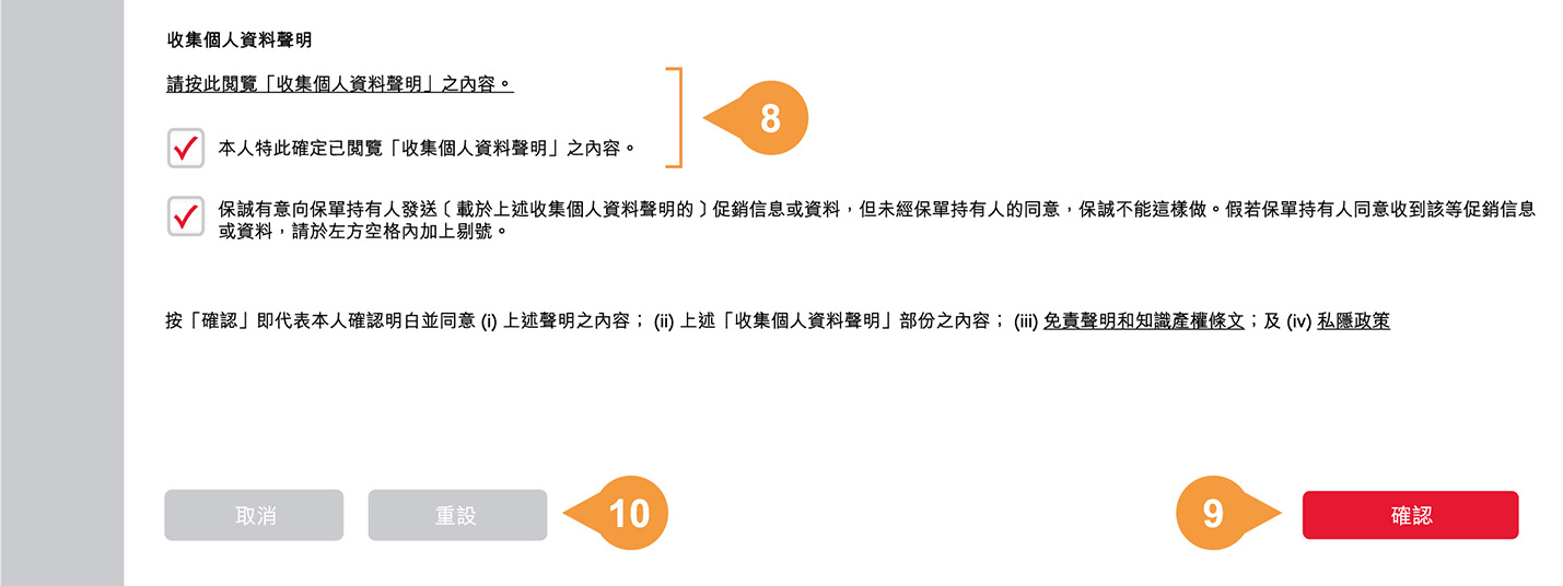 按「確認」以表示明白並同意收集個人資料聲明之內容及保誠的私隱政策,以完成申請。