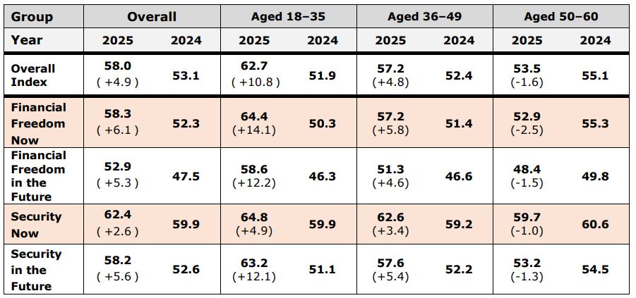 The survey findings point to a modest improvement in the overall index score, which rose to 58.0 points out of 100 this year from 53.1 points last year. The scores across the four pillars2 – “Security Now,” “Security in the Future,” “Financial Freedom Now” and “Financial Freedom in the Future” – all rose from last year’s levels. Notably, the score for current financial freedom saw the largest year-on-year increase of 6.1 points. For an overview of the overall Financial Wellbeing scores, please refer to Appendix.