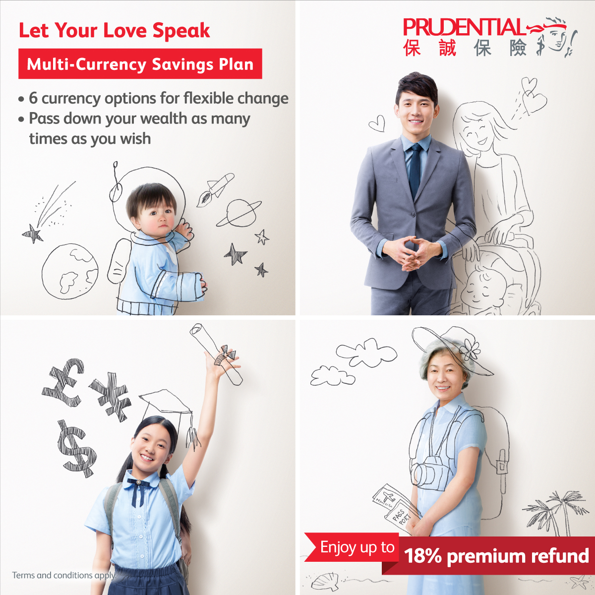 From now till 27 May, customers successfully taking out the “Evergreen Wealth Multi-Currency Plan” can enjoy up to an 18% refund of the first-year annualised premium. For information about the promotional offers, please refer to the terms and conditions on the official website of Prudential Hong Kong Limited.