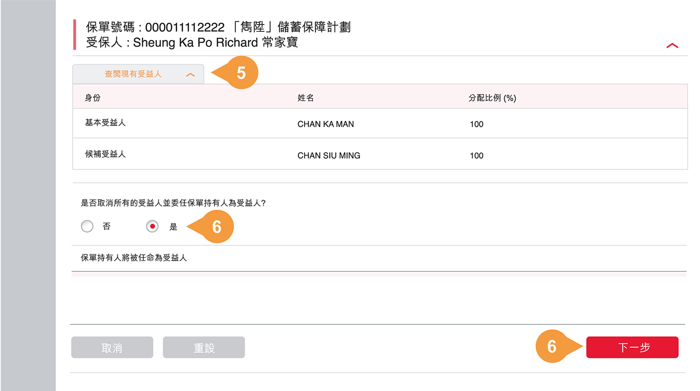 如欲取消所有的受益人並委任保單持有人為受益人,選擇「是」及按「下一步」。