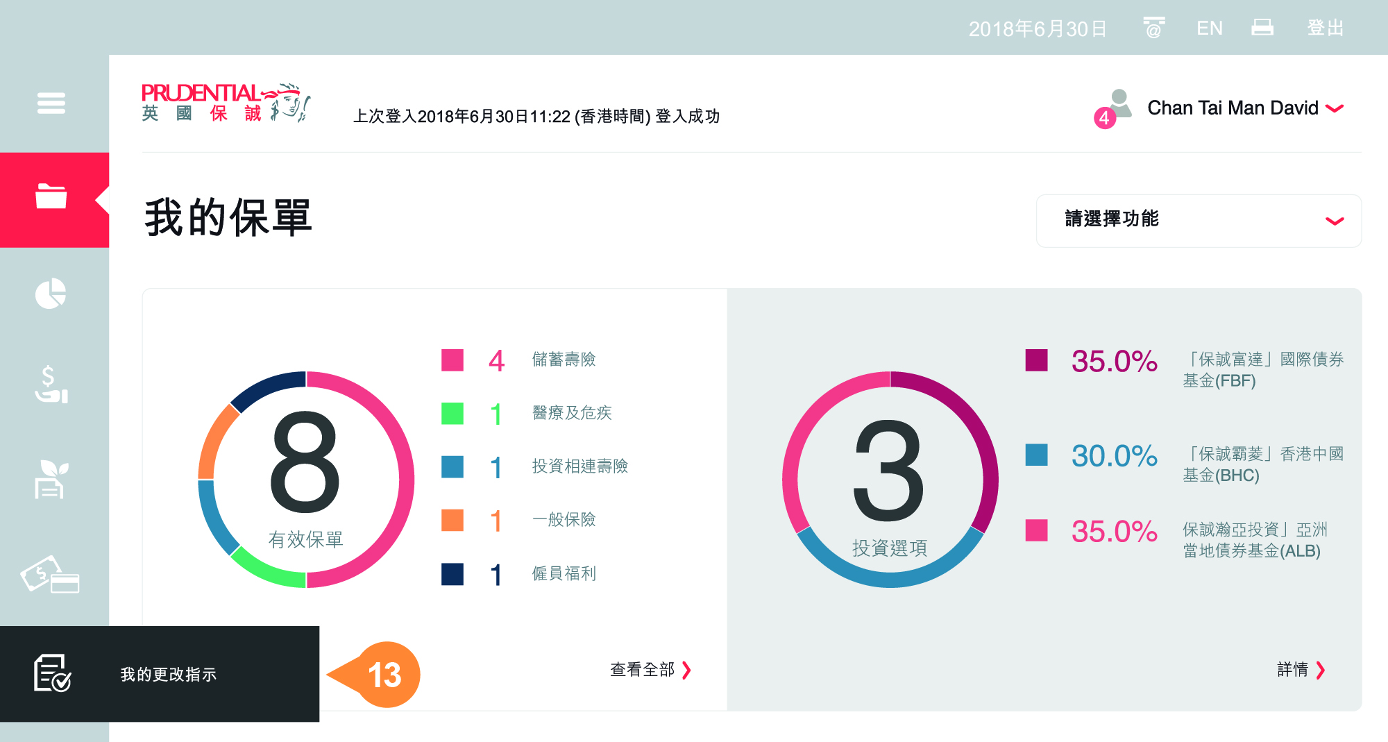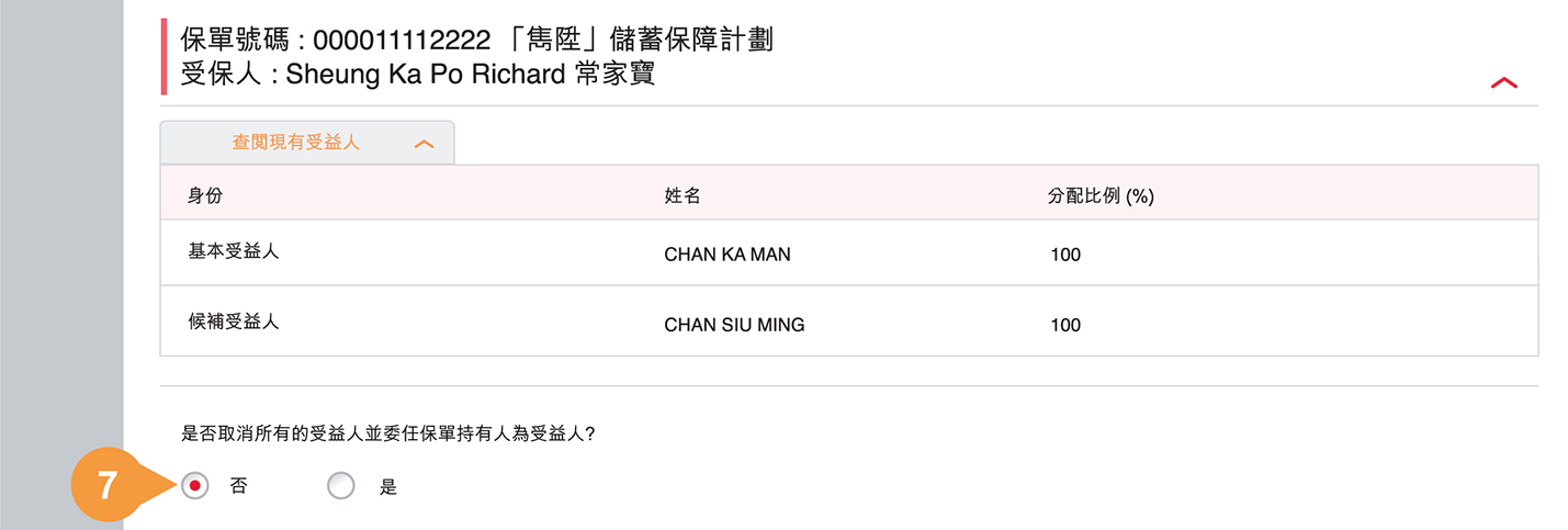 您可以更改受益人之間的分配百分比、刪除個別受益人、修改個別受益人的資料及/或委任新受益人。