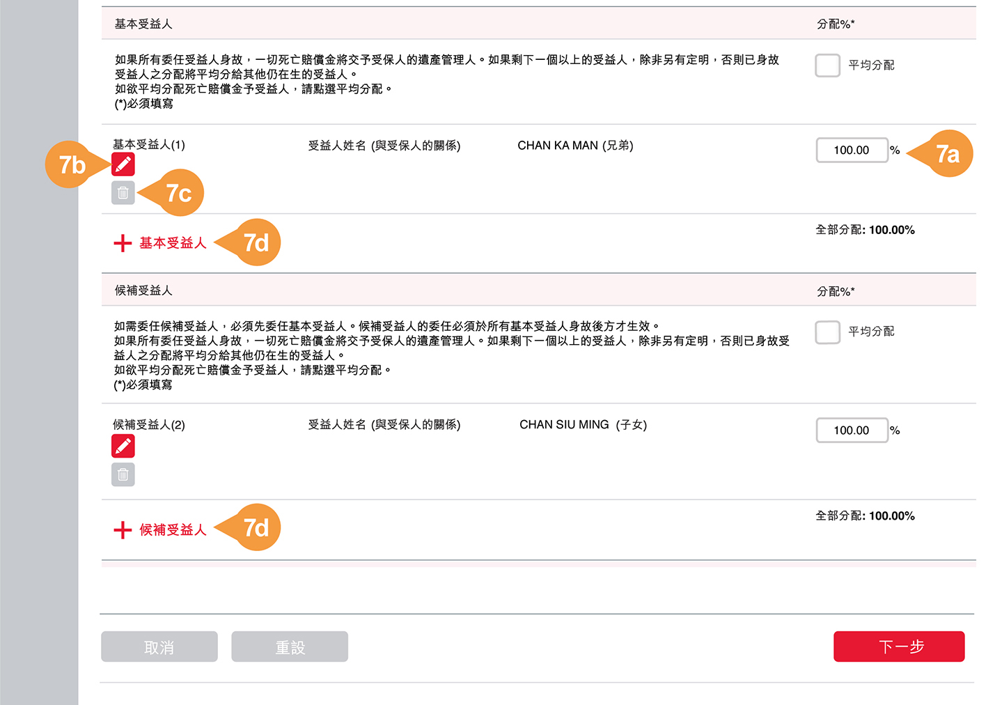 注意:每組受益人(基本受益人或候補受益人)獲分配的百分比總和必須為100%。