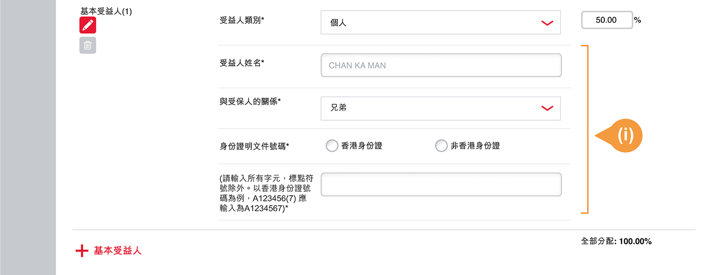 注意:如受益人並非受保人之直系親屬(包括配偶/父母/子女/兄弟姊妹/祖父母/孫),您必須提供受益人之身份證/護照號碼。