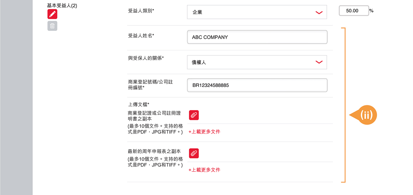 請提供受益人姓名、與受保人的關係及商業登記號碼/ 公司註冊編號。
