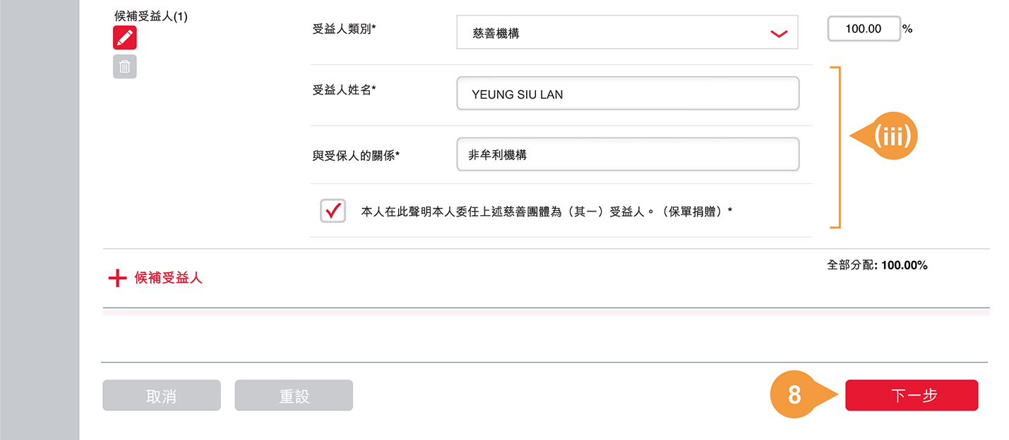 提供慈善機構的全名後,請查閱並聲明您願意委任該慈善機構(其一)受益人(保單捐贈)。