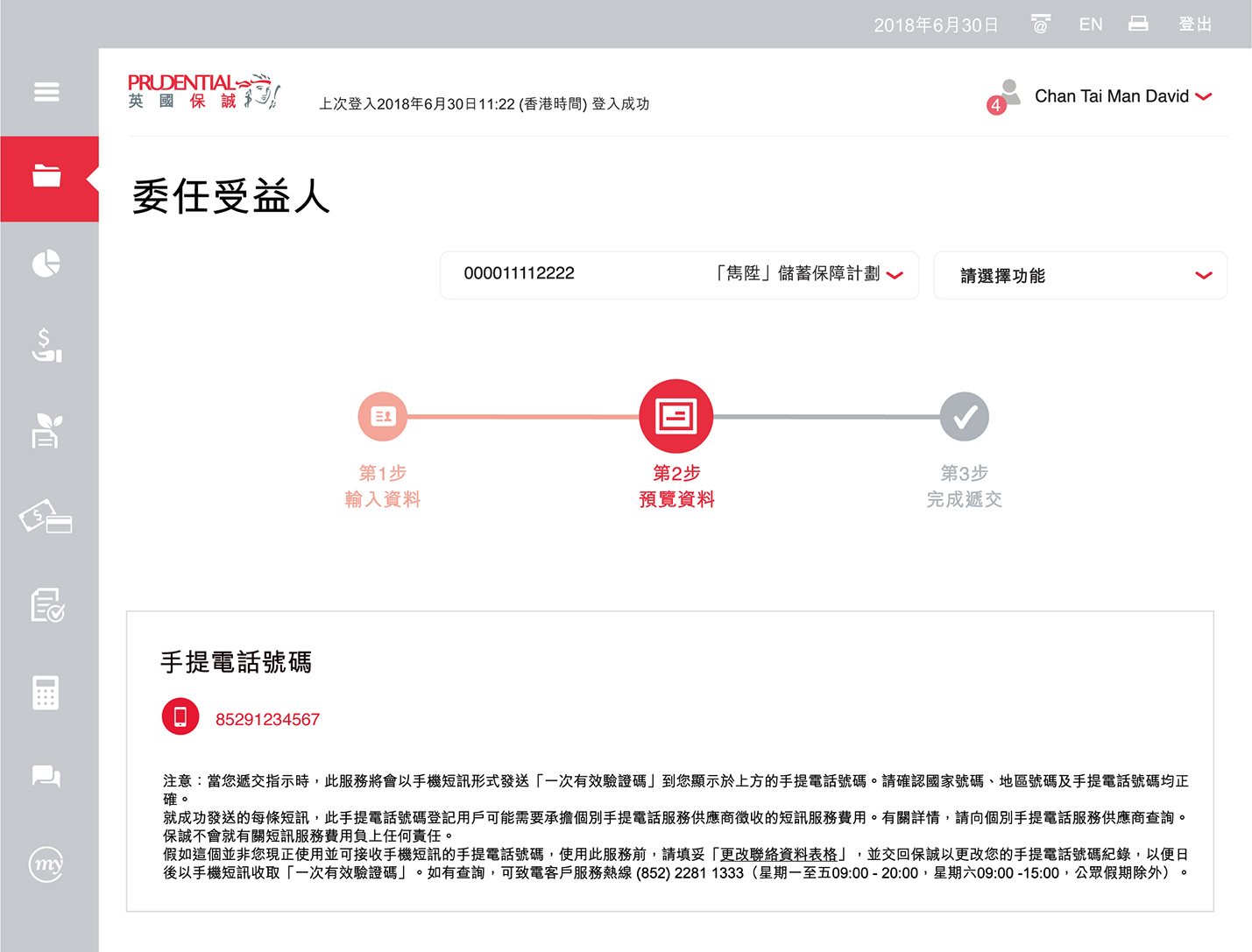 如所顯示的手提電話號碼並非您現正使用及可接收短訊的手機,於使用此服務前,請填妥「更改聯絡資料表格」,並交回保誠以更改您的手提電話號碼紀錄,以便日後以手機短訊收取「一次有效驗證碼」。