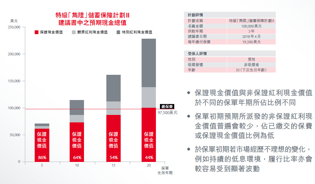 註:假設保單生效期間並沒有任何保單貸款,更改保額或套現任何紅利之現金價值。