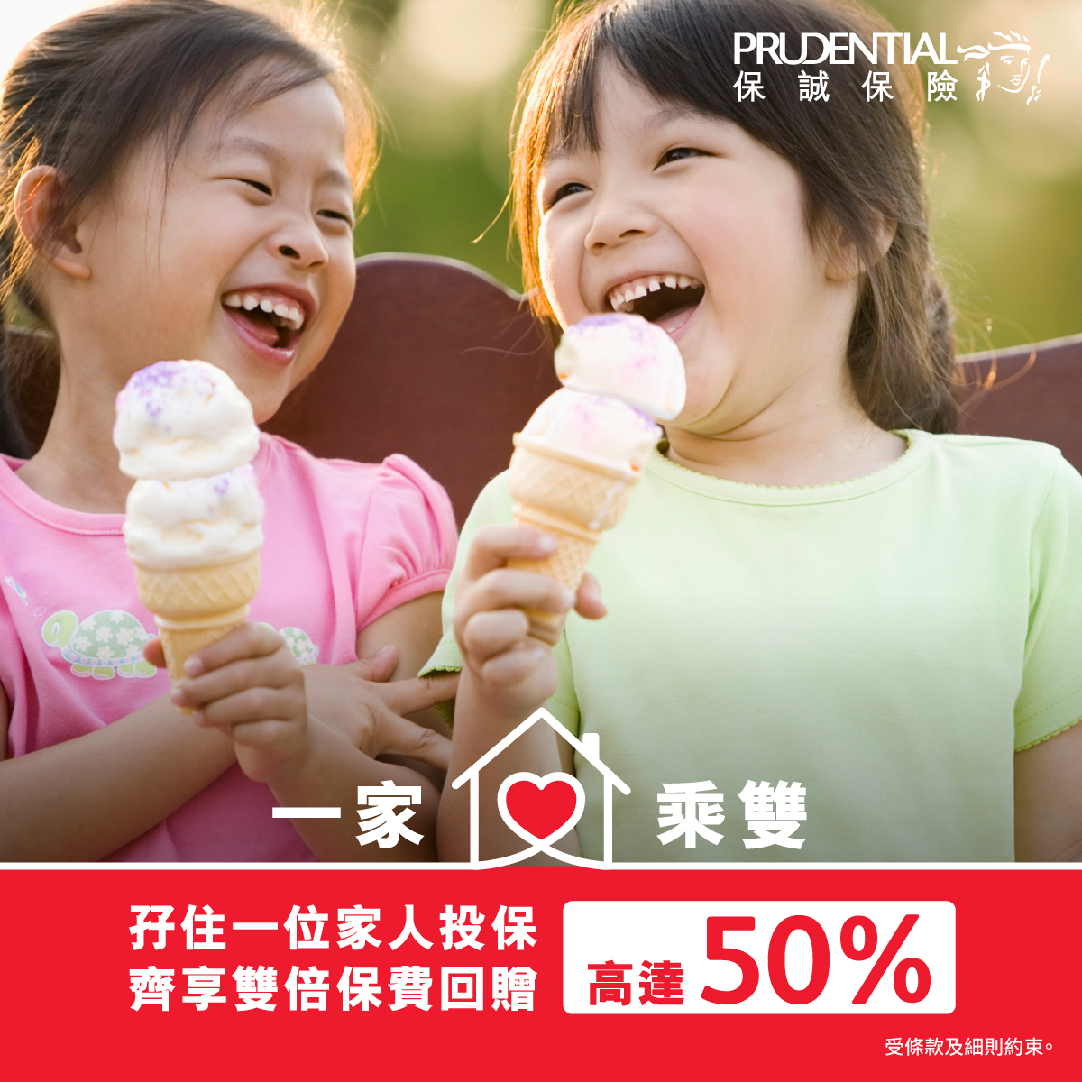 「惠您分享 · 感謝賞」以及全新「一家乘雙」推廣活動受有關條款及細則約束,詳情請參閱保誠保險官方網站。