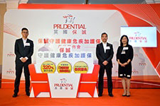保誠今天宣佈推出守護健康危疾加護保,並公佈產品三大主要特點:市場獨有「良性腫瘤額外保障」、就癌症、心臟病及中風提供高達320%的延伸保障、以及索償早期嚴重疾病保障後享有12個月保費豁免。(左起)保誠醫務總監邱家騏醫生、保誠行政總裁容佳明及保誠產品管理高級總監黃麗珍今日在產品發佈會主持揭幕儀式。