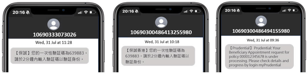 提防虛假短訊,本公司只會使用以「#Prudential」開頭的「已登記發送人名稱」發出短訊予香港手機號碼用戶。如收到任何冒充保誠的可疑短訊或連結: